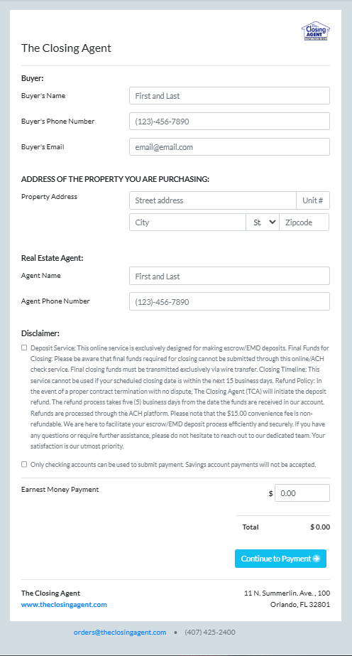 At The Closing Agent, we understand the value of your time and convenience when purchasing a home or property. One important aspect of this process is your earnest money deposit (EMD), also commonly referred to as the “escrow deposit”. We recognize that the traditional methods, such as visiting our physical locations, can be challenging and time-consuming.